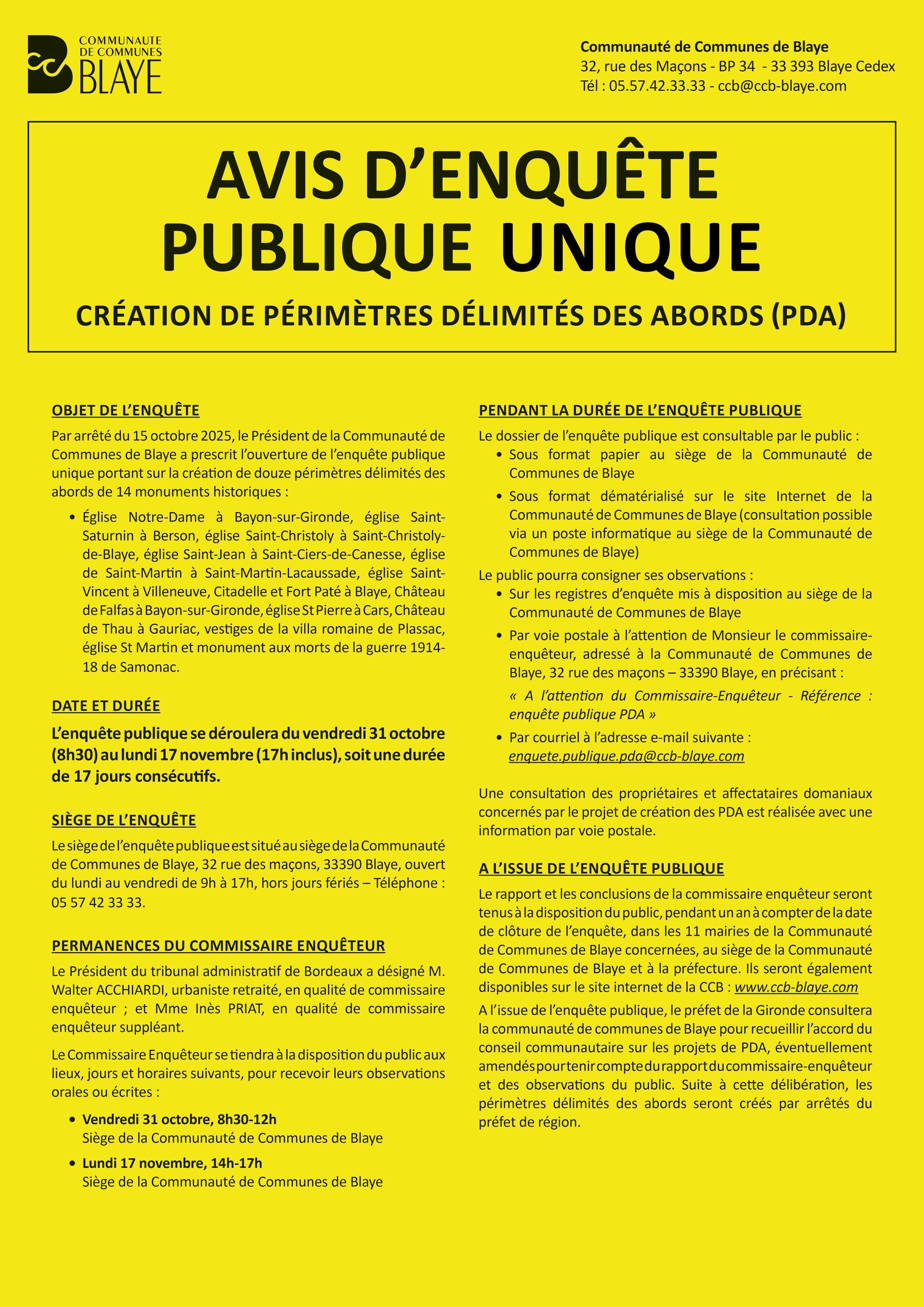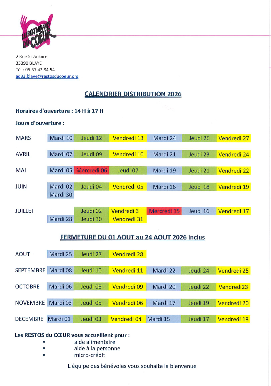 - Lundi 17 novembre, 14h-17h au siège de la Communauté de Communes de Blaye